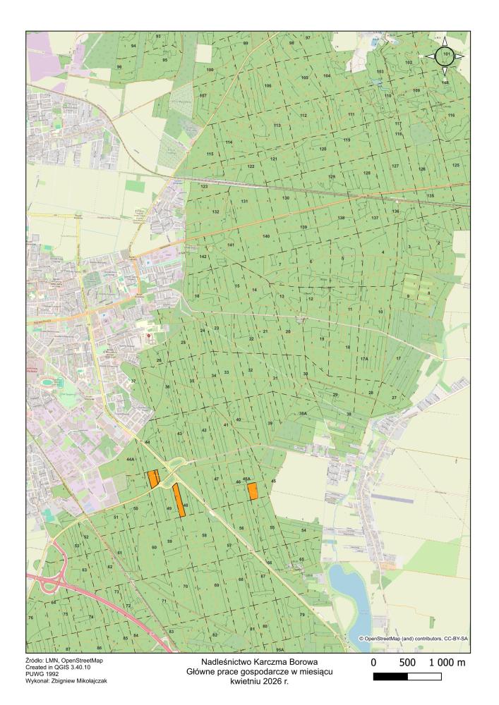 przedstawiamy mapkę z zaznaczonymi obszarami, gdzie w miesiącu kwietniu prowadzone są prace gospodarcze w pobliżu miasta Leszno :