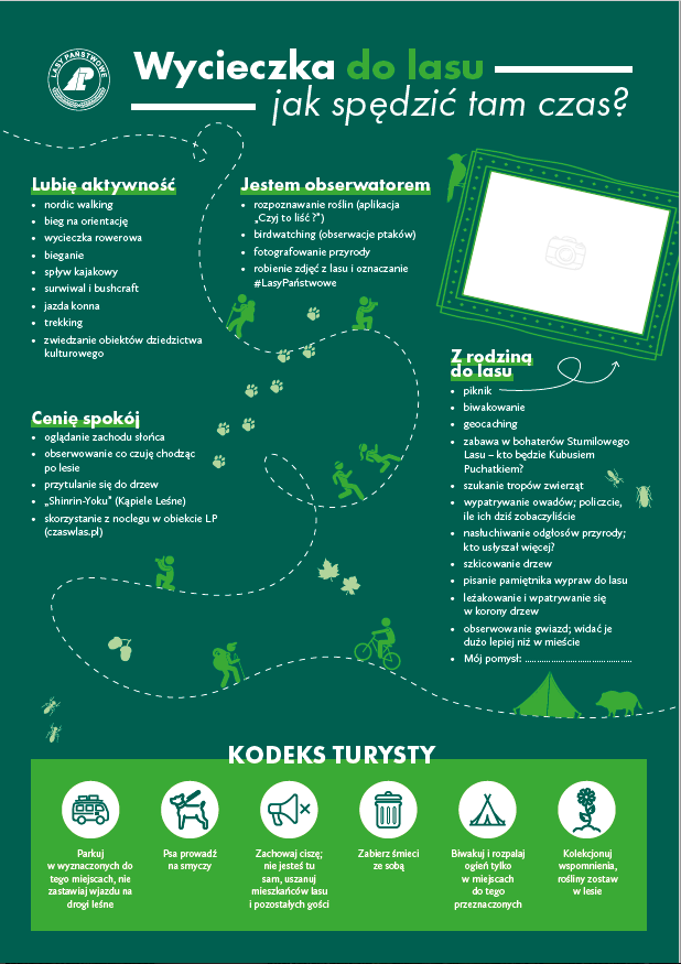 Nadleśnictwa dysponują miejscami do odpoczynku, rekreacyjno – wypoczynkowe wiaty zapewnią schronienie przed deszczem czy słońcem. Przy drewnianych ławostołach wygodnie możemy zjeść drugie śniadanie i odpocząć po wędrówce, a parking leśny zapewni sanitariat. Na ścieżce edukacyjnej znajdziemy wiele informacji, a interaktywne tablice zachęcą do gry nie tylko najmłodszych.