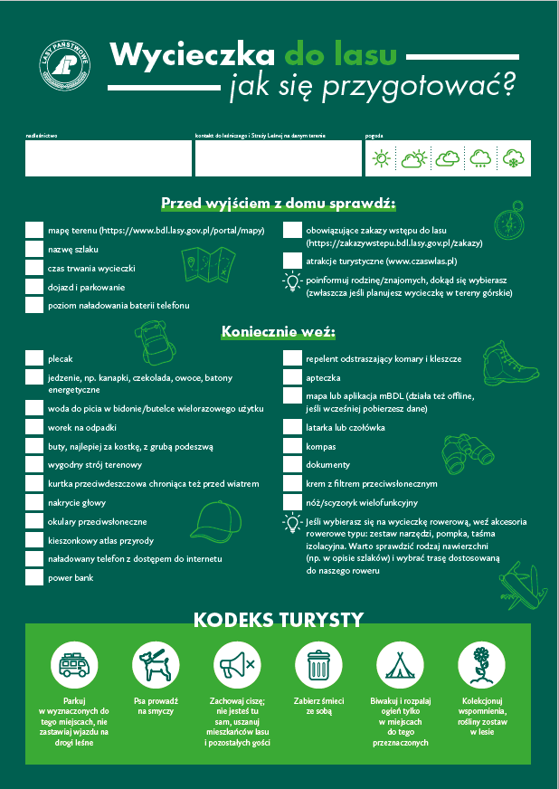 Jeśli już wiemy jakie możliwości daje nam las i jak zagospodarować czas w nim spędzony, to teraz czas na specjalną checklistę, dzięki której spakujemy plecak i o niczym nie zapomnimy. Czarnobiała wersja do wydruku ułatwi każde wyjście w teren.